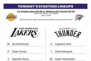 體育資訊04月08日訊 今日10:30,湖人將在主場(chǎng)再戰(zhàn)雷霆。