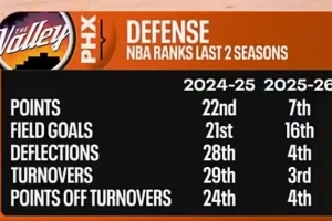 本賽季太陽在失分、對手進球數(shù)、場均干擾防守次數(shù)、造對手失誤、利用失誤得分等多項數(shù)據(jù)上,相比上賽季都有巨大提升,多項數(shù)據(jù)聯(lián)盟前列。