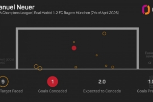 拜仁門將諾伊爾本場比賽做出9次撲救,他是有相關統計以來,首位在客戰(zhàn)皇馬的歐冠淘汰賽中做出9次撲救的門將。