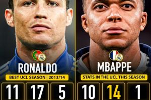 姆巴佩本賽季歐冠出戰(zhàn)10場比賽已經(jīng)打進(jìn)14球,高居射手榜第一。而在歐冠單賽季總進(jìn)球排行榜上,姆巴佩距離C羅在2013/14賽季的17球紀(jì)錄還有3球之差。