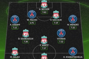 后衛(wèi):阿什拉夫(巴黎)、帕喬(巴黎)、范戴克(利物浦)、門(mén)德斯(巴黎)