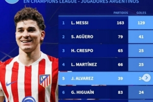 體育資訊4月9日訊 在歐冠淘汰賽首回合馬競2-0擊敗巴薩的比賽中,阿爾瓦雷斯破門。以下為歐冠歷史阿根廷球員射手榜: