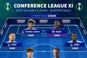 體育資訊4月9日訊 德轉(zhuǎn)官網(wǎng)公布了本賽季歐協(xié)聯(lián)1/4決賽身價最高十一人陣容,英超水晶宮獨(dú)占九席。德轉(zhuǎn)對此陣容的解讀也十分簡明扼要:“顯然,這就是水晶宮是本賽季歐協(xié)聯(lián)冠軍大熱門的原因?!?/p>