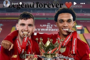 阿諾德曬出了自己效力利物浦時期和羅伯遜一同捧起英超冠軍獎杯的合照,并配文:“永遠的傳奇!”