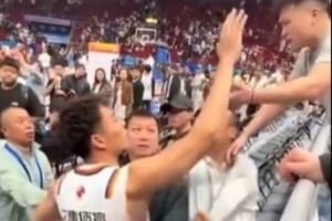 比賽結(jié)束后,場邊發(fā)生了一個小插曲,上海男籃球員李添榮想和場邊的球迷擊掌互動,但是遭到北京主場工作人員的攔截。