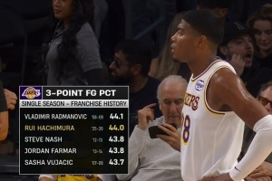 轉(zhuǎn)播方給出了本賽季八村塁的三分命中率,為44%(本場比賽前),暫列湖人隊史第二高,僅次于弗拉迪米爾·拉德曼諾維奇的44.1%。