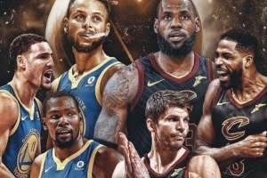 2018年總決賽宣傳海報中,勇士是杜庫湯,騎士則是詹姆斯、TT和科沃爾。