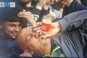 體育資訊04月13日訊 英超第32輪,曼城客場3-0完勝切爾西。比賽過程中轉(zhuǎn)播鏡頭對(duì)準(zhǔn)了看臺(tái)上的一位曼城球迷,他拿著印有阿森納標(biāo)志的水瓶瘋狂嘲諷慶祝,瞬間走紅。