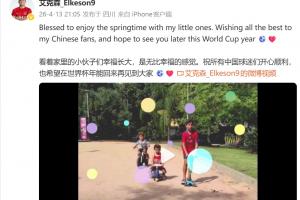 艾克森在社媒雙語(yǔ)發(fā)文:Blessed to enjoy the springtime with my little ones. Wishing all the best to my Chinese fans, and hope to see you later this World Cup year ????